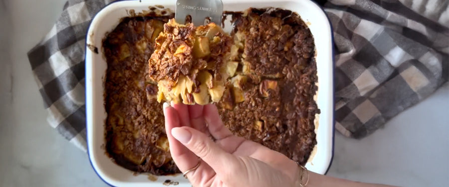 The following morning, preheat the oven to 180*C. Bake for 35-40 minutes or until golden brown. We love to serve this warm out of the oven with a dollop of yoghurt, fresh berries and ground seeds.