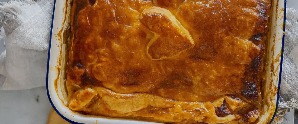 Transfer it to an ovenproof enamel pie or baking dish. Top the mixture with the puff pastry and ‘tuck in’ around the edges.