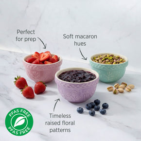 $29.00Our Baking Traditions three-piece Mini Prep Bowl set is the perfect size for keeping ingredients organised as you cook. Featuring a timeless raised floral pattern and finished in soft macaron hues, they’re as delightful to display as they are to use.