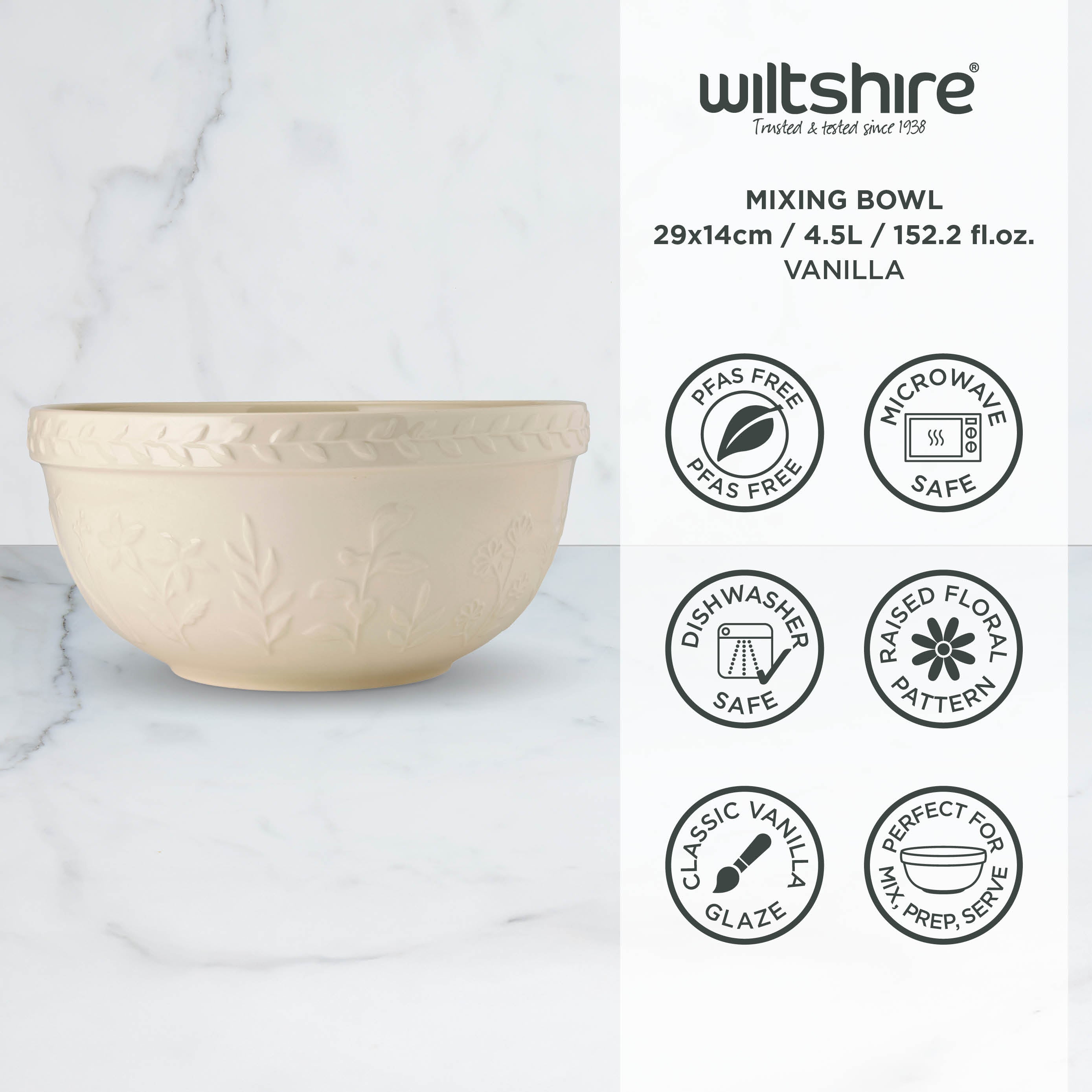 Meet the mixing bowl that bring everyday baking back to its beautiful best. Our Baking Traditions 29cm mixing bowl is sturdy, microwave and dishwasher safe, and comfortable to use. Featuring a timeless raised floral pattern for that touch of charm and finished in soft vanilla, it's as delightful to display as it is to use.