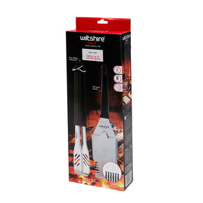 Handy and simple, this multi-functional pack comes with a spatula that has a curved, serrated edge for superior cutting and slicing. The bottle opener fitted into the handle will make sure you won't go thirsty. The lightweight piercing tongs with its tapered head, easily grips any BBQ food. The hollows in the blade keep food from clinging. The scraper is tough on burnt-on food, removing it easily without scratching. All in one neat little kit.