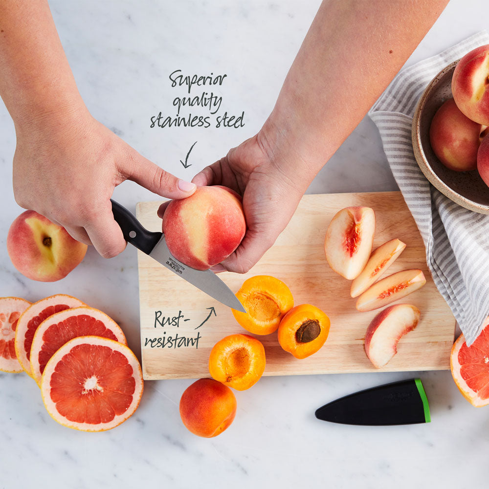The Staysharp Paring knife's fine sharp edge is designed to take the frustration away so that you can cut that apple or tomato with ease. Small and handy, it’s your go-to knife that’s as comfortable in your kitchen as it is outdoors. Like all Wiltshire knives, it’s made from superior quality stainless steel so it’s rust-resistant making it perfect for those who cherish the ‘quick and easy’ and those with a strong desire to create roses from tomato peels.