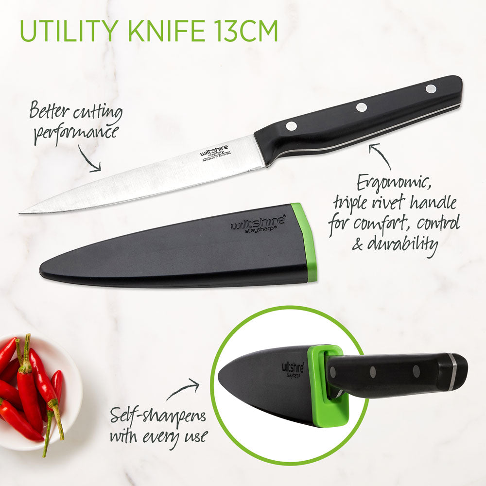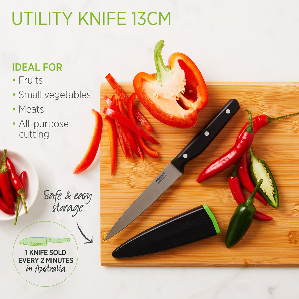 When the paring knife is too short and the chef's knife is too big, this utility knife packs a punch. It’s perfect for peeling, cutting, slicing and trimming meat, fruit and vegetables. Thanks to the clever self-sharpening system of Staysharp you can ensure no more blunt knives. Simply insert and withdraw the knife from the scabbard for a sharp knife every time. But don’t just use it in the kitchen, this knife is great at picnics and on holidays too.